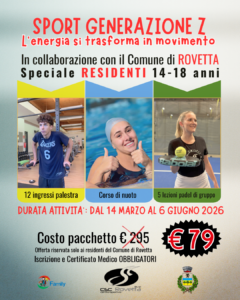 /Il Comune di Rovetta, in collaborazione con il CSC Rovetta, propone a tutti i residenti di età compresa tra i 14 e i 18 anni il Pacchetto Sportivo “Sport Generazione Z”, con inizio il 14/03 e termine il 06/06/2026. Il pacchetto comprende: Corso di nuoto settimanale (12 o 13 lezioni) visiona gli orari: clicca […]